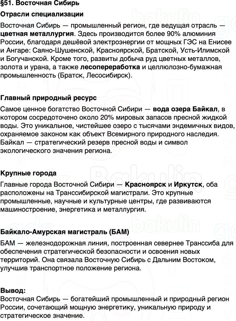 Краткое содержание Параграф 51 Восточная Сибирь География 9 класс Алексеев