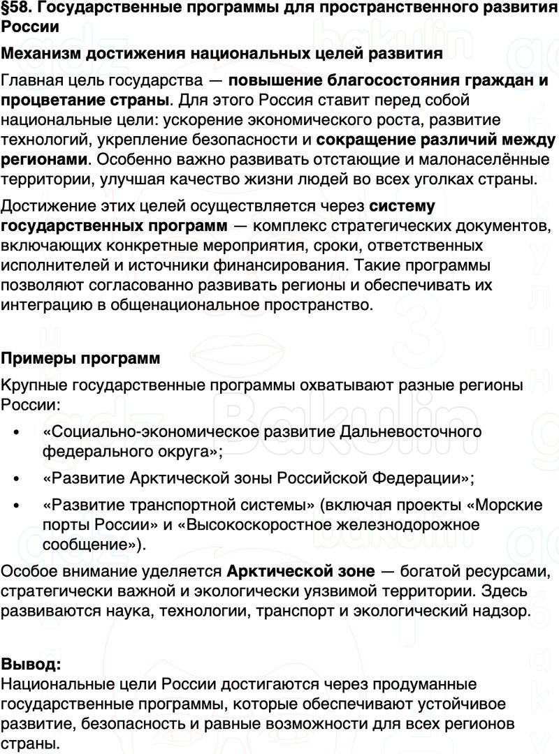 Краткое содержание Параграф 58 Государственные программы для пространственного развития России География 9 класс Алексеев