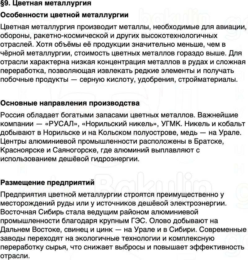 Краткое содержание Параграф 9 Цветная металлургия География 9 класс Алексеев